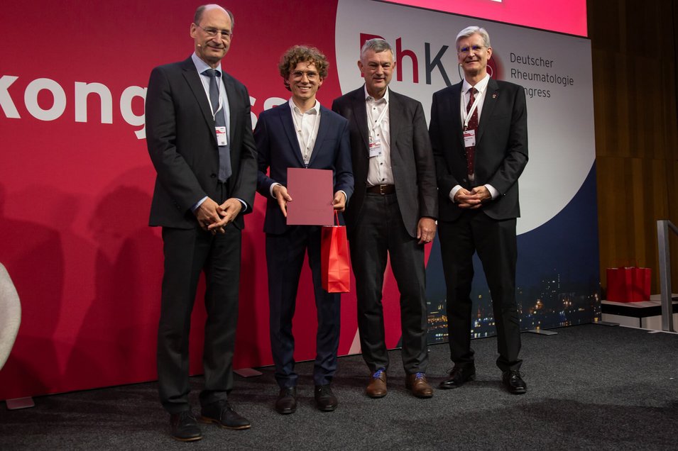 Die Deutsche Gesellschaft für Rheumatologie und Klinische Immunologie e.V. (DGRh) zeichnet Dr. med. Jacob Casimir Ritter mit dem Joachim Kalden-Promotionspreis 2025 aus. Der 28-Jährige erhält die Auszeichnung für seine Dissertation zur „Charakterisierung des Interferonsignalweges in T- und B-Zellsubpopulationen bei COVID-19-Erkrankung und beim primären Sjögren-Syndrom“. Die DGRh würdigt damit eine herausragende wissenschaftliche Leistung auf dem Gebiet der Rheumatologie. Der Preis ist mit 2.000 Euro dotiert. Die Preisverleihung fand im Rahmen des Deutschen Rheumatologiekongresses 2025 in Wiesbaden statt. Prof. Dr. med. Hendrik Schulze-Koops aus München hielt die Laudatio.