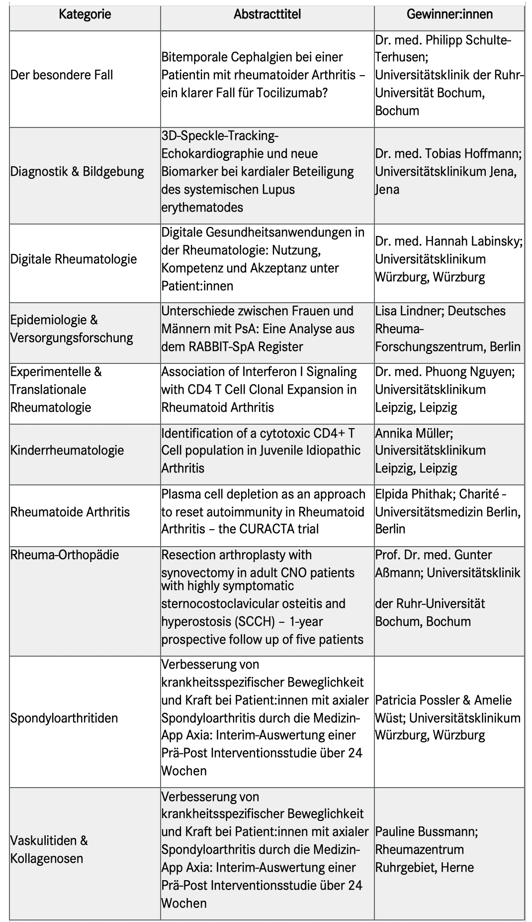 Auf dem Deutschen Rheumatologiekongress 2025 konkurrierten auch dieses Mal die wissenschaftlichen Kurzbeiträge und Poster um die Wissenschaftspreise. Kongresspräsident Prof. Dr. Andreas Schwarting wählte aus allen vom Programmkomitee festgelegten Kategorien jeweils eine herausragende Arbeit aus. Und so decken die prämierten Arbeiten ein breites fachliches Spektrum ab – von Kinderrheumatologie über digitale Anwendungen bis hin zu translationaler Forschung.