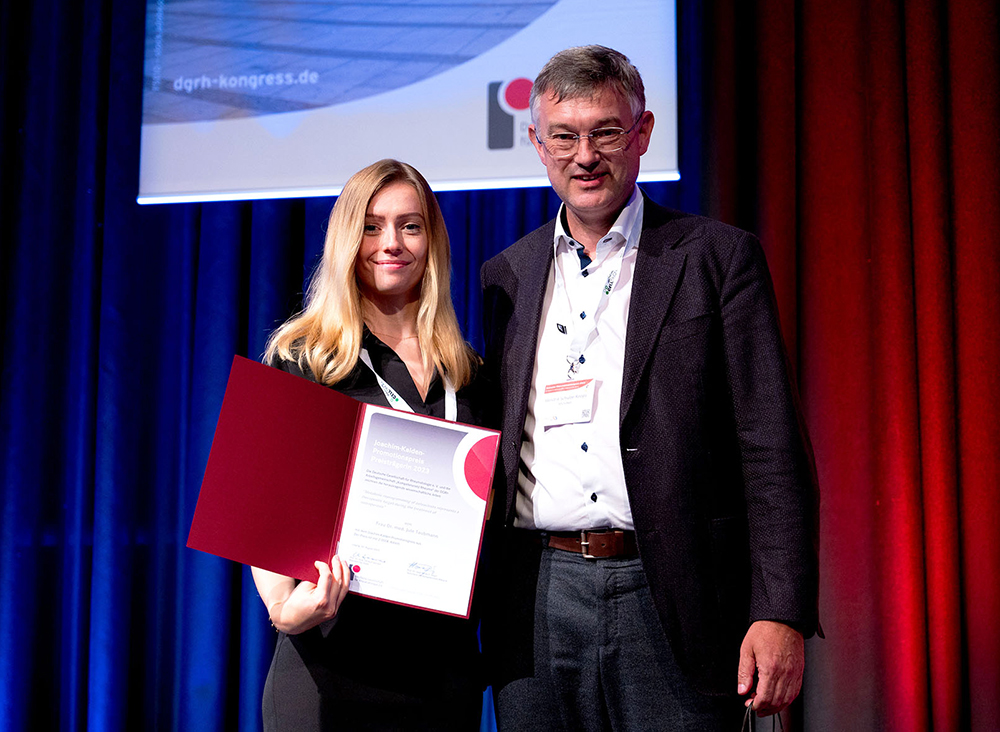 Die DGRh und ihre Arbeitsgemeinschaft „Kompetenznetz Rheuma“ loben seit 2021 den Joachim-Kalden-Promotionspreis aus. Dieser umfasst je eine klinisch orientierte und eine grundlagenwissenschaftliche Dissertation zu rheumatologischen Fragestellungen aus dem deutschsprachigen Raum. Prof. Dr. med. Hendrik Schulze-Koops überreichte die Preise an die beiden Nachwuchswissenschaftler und würdigte sie mit seiner Laudatio während der Eröffnungsveranstaltung des Jubiläumskongresses der DGRh e.V. in Berlin.