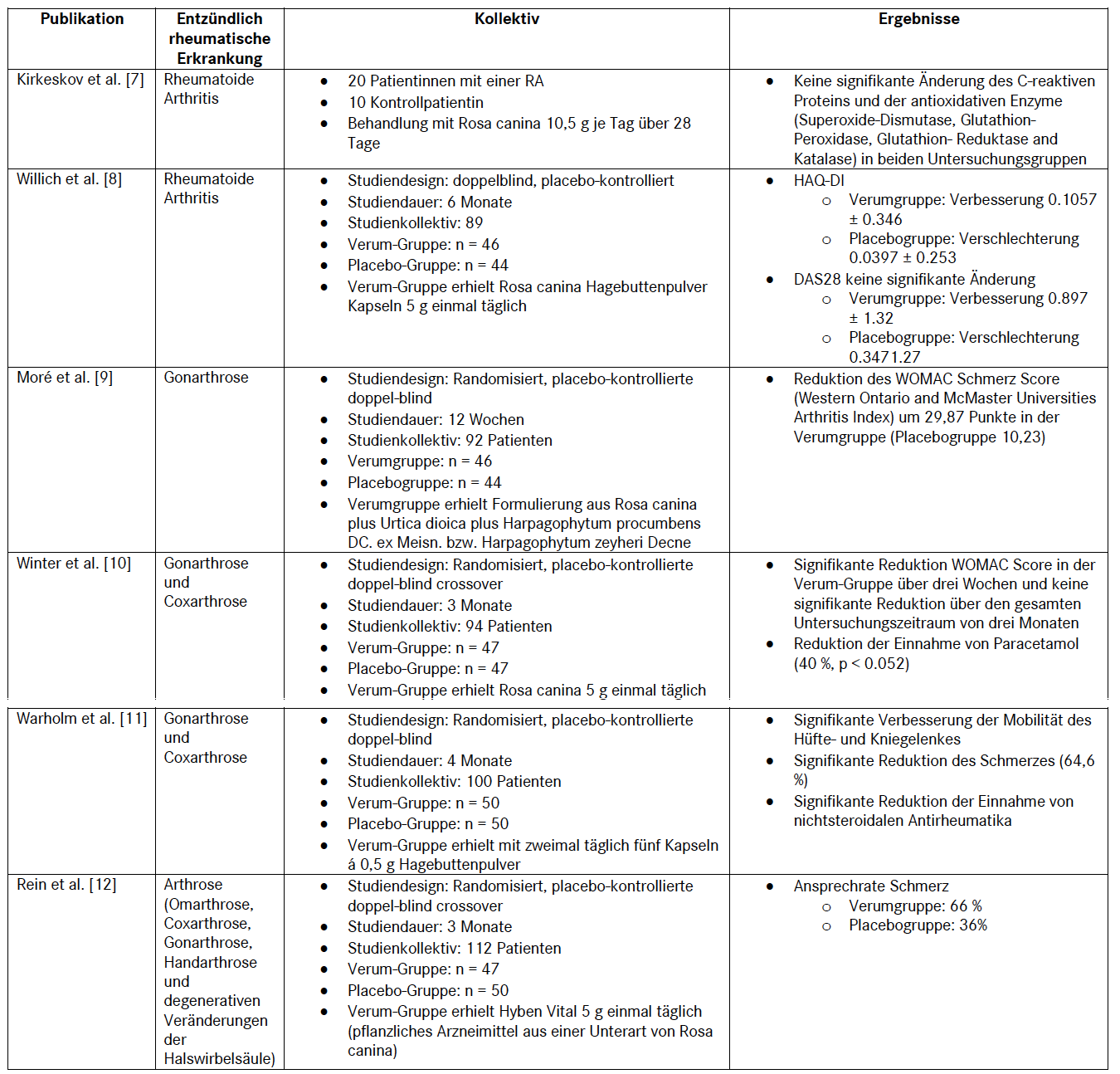 Eine Metaanalyse untersuchte die Wirksamkeit von Rosa canina (Hagebutte) für die symptomatische Behandlung der Arthrose. Eingeschlossen wurden drei randomisierte klinische Studien von Winther et al. [10] , Warholm et al. [11] und Rein et al. [12] [13], die alle vom Hersteller des Präparates gesponsert waren. In der Metaanalyse konnte eine gering bis mäßig starke, kurzzeitige Reduktion des Arthroseschmerzes durch die Einnahme von Rosa canina nachgewiesen werden, wobei die Autoren darauf hinweisen, dass die Wirksamkeit und Sicherheit von Rosa canina an großen Kohorten evaluiert werden sollte [13].